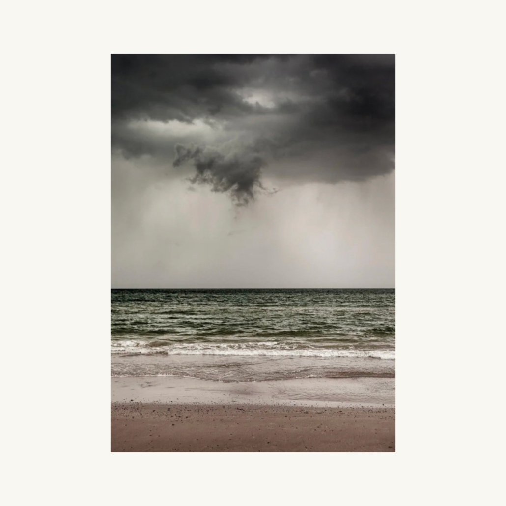 Stemningsfuld plakat fra Blokhus strand, hvor dramatisk himmel møder Vesterhavets særlige farver. Fotografiet indfanger kontrasten mellem klar blå himmel og mørke regnskyer. Printet på kvalitets papir – et naturmotiv, der skaber ro og fascination i hjemmet.