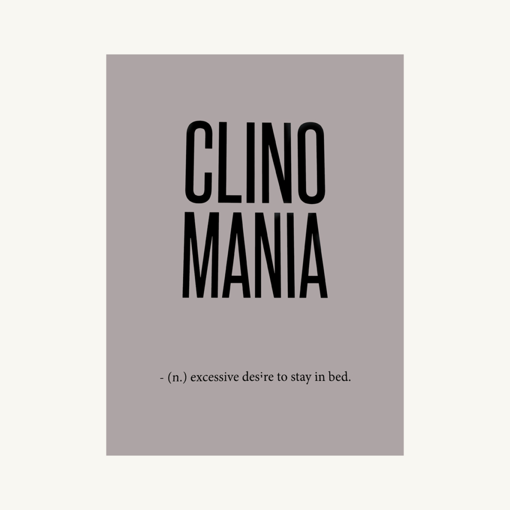 Ordet ’Clinomania’ (klinomani på dansk) beskriver en overdreven vedvarende trang til at blive i sengen, fordi sengen føles som det dejligste sted i verden at være. Denne plakat er en minimalistisk definition af ordet, som er oplagt at have hængende i soveværelset, som et humoristisk og let indspark.