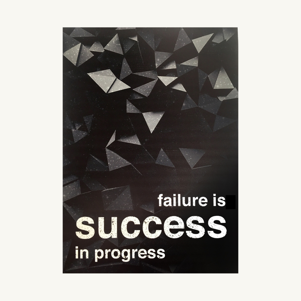 En markant plakat med citatet “Failure is Success in Progress” i store hvide bogstaver, sat mod en baggrund af sorte, tredimensionelle trekanter. Det stærke grafiske udtryk kombinerer minimalisme med dybde og giver motivet en moderne, rå kant. Perfekt som inspiration i hjemmekontoret, på studieværelset eller i kreative rum, hvor man ønsker et dagligt skud motivation og fokus.