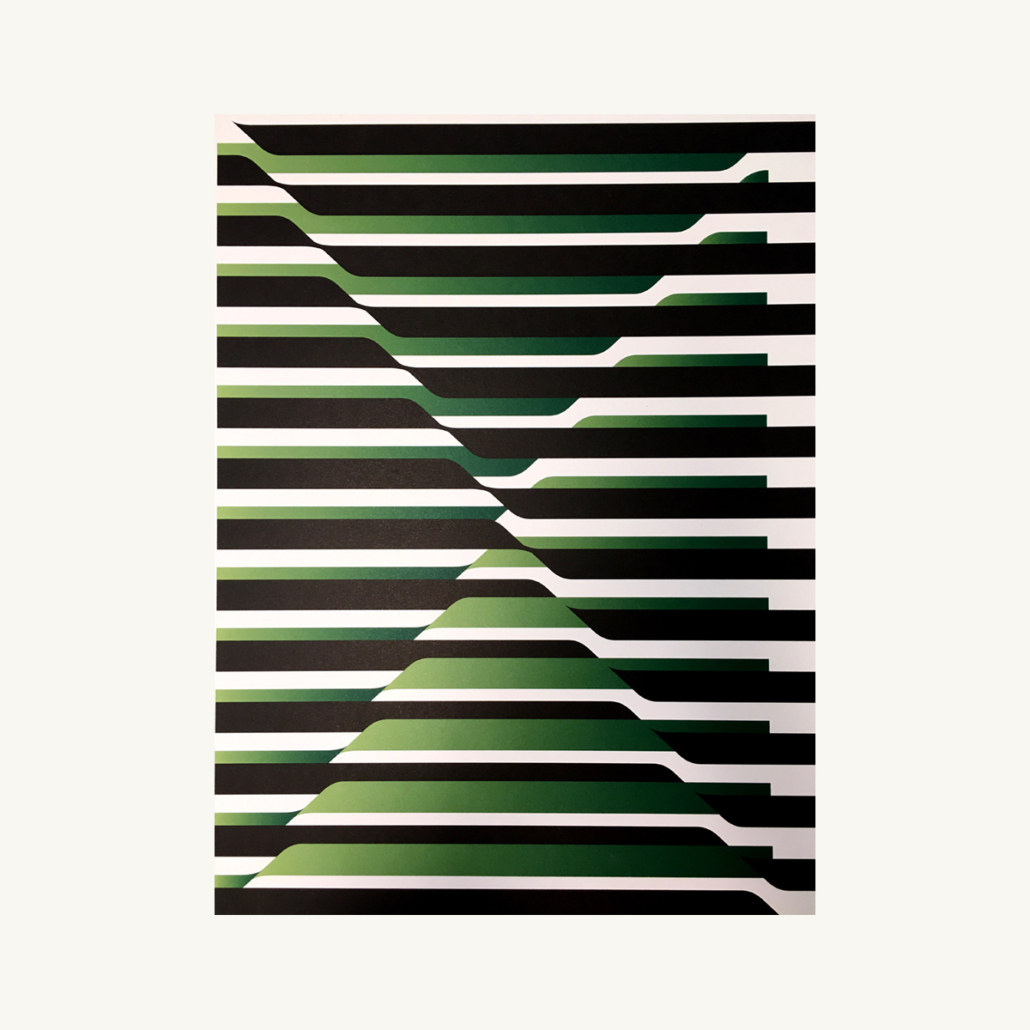 Denne grafiske plakat er bygget op af sorte og grønne linjer der skifter retning og tykkelse, hvilket skaber 4 felter af forskellige mønstre. Værket er dynamisk og levende, og stilen er minimalistisk og fokuserer på geometriske former og optiske effekter. Er du glad for konstruktivisme og farver, er dette værk perfekt til dig.