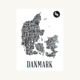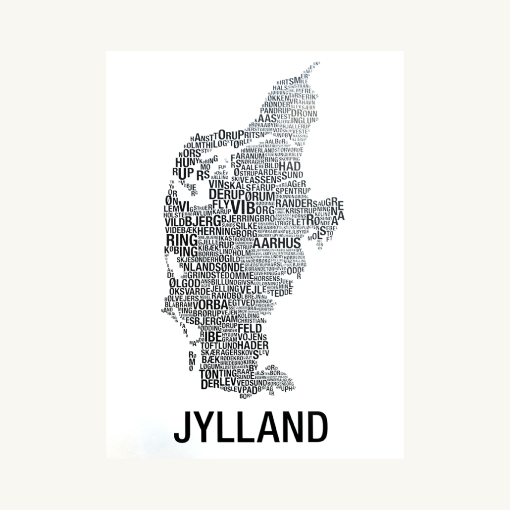 Stilfuld plakat af Jylland skabt udelukkende med bynavne i typografisk design. Det enkle sort-hvide udtryk gør den let at kombinere med enhver indretning. En perfekt gaveidé til dem med rødder eller kærlighed til Jylland.