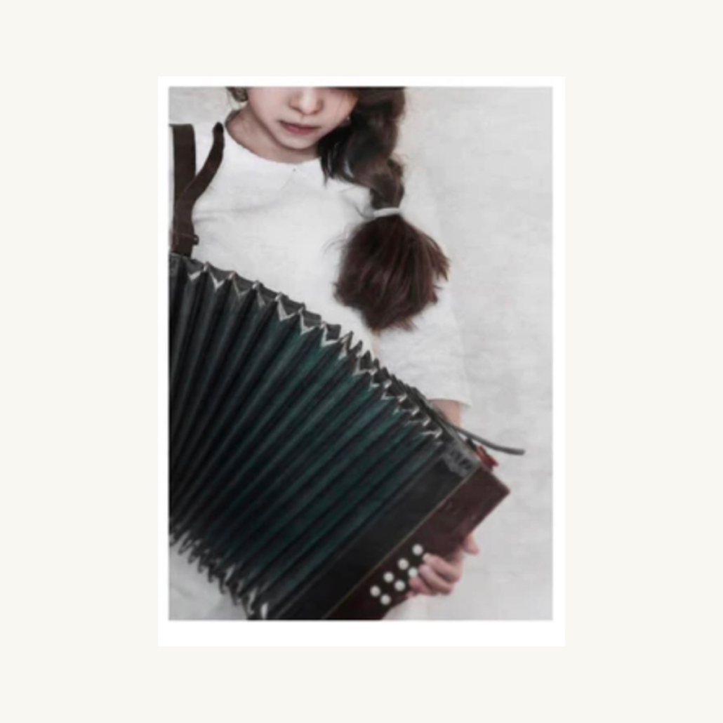 Motivet er et nærbillede af en barn som står med en harmonika i armene, og kigger ned på den. Farverne er nedtonede, næsten monokrome. Billedet vækker følelser og minder til barndommen. De dæmpede farver og naturlige lys, gør det nemt at kombinere og matche det med moderne interiør design.