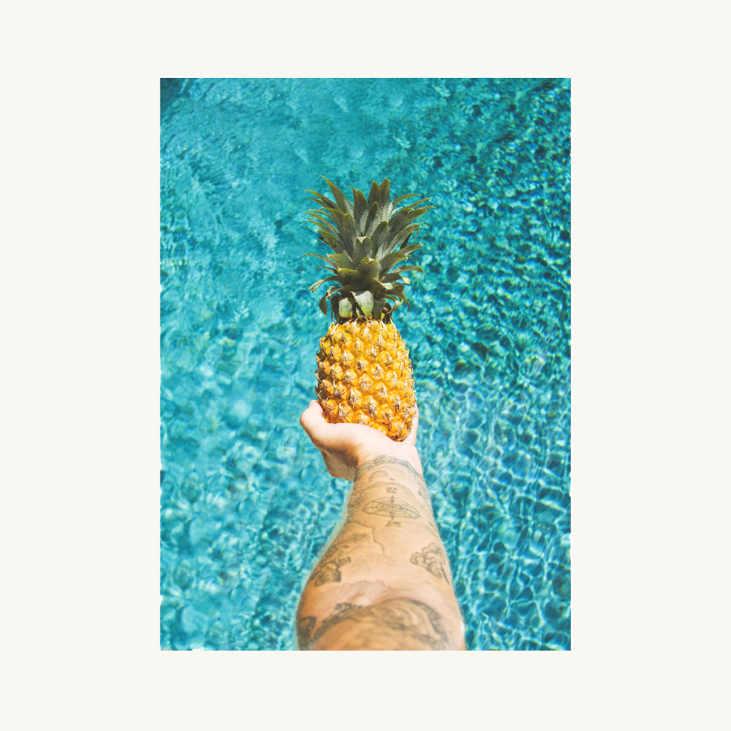 Kom i sommerstemning med denne fotografiske plakat, af en ananas med en pool som baggrund. Farvekontrasten mellem ananasen og poolens krystal-blå vand skaber liv og glæde i omgivelserne.