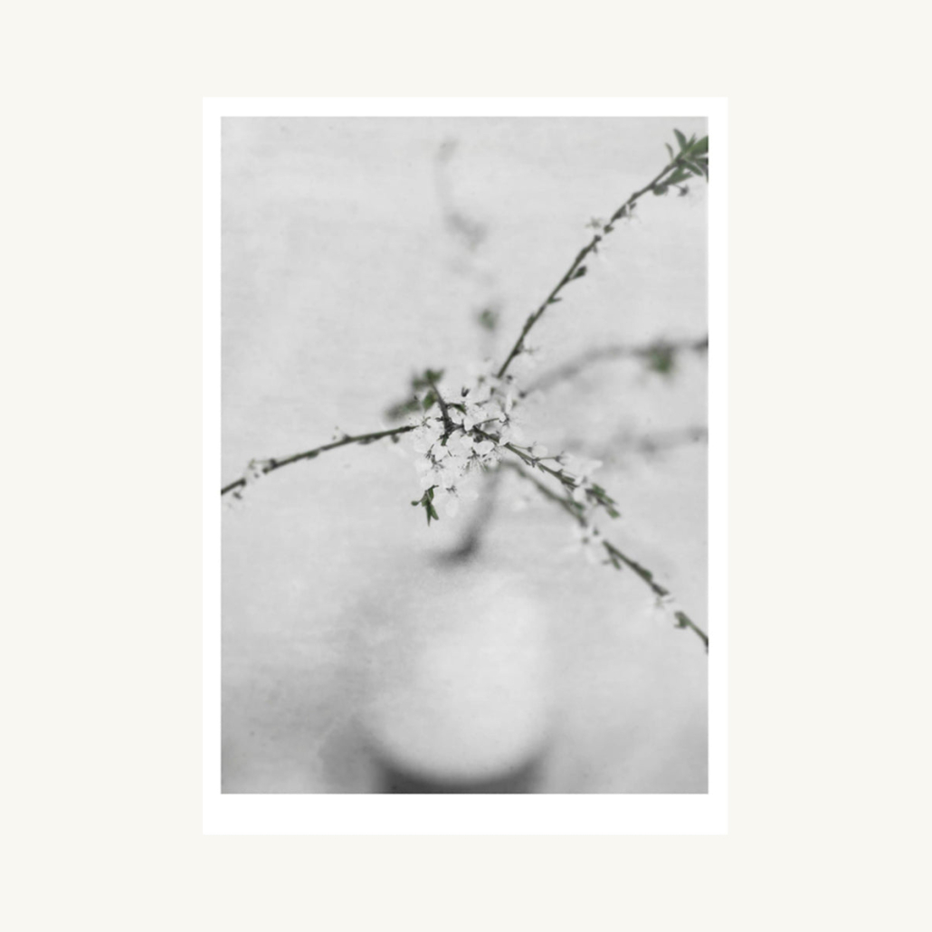 Denne sort-hvide plakat portrætterer en blomstrende gren i en vase. Motivet er simpelt, men den slørede baggrund skaber stemning og et drømmende rum.