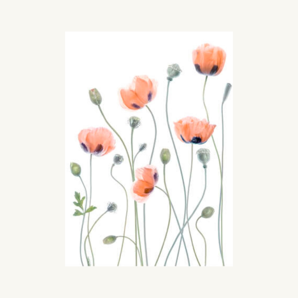 Et smukt kunsttryk med sarte valmuer i ferskentoner omgivet af lette, grønne strå. Den hvide baggrund fremhæver farverne og giver motivet et luftigt, nordisk udtryk. Plakaten har en rolig og varm atmosfære, der passer perfekt i stuen, køkkenet eller som del af en billedvæg.